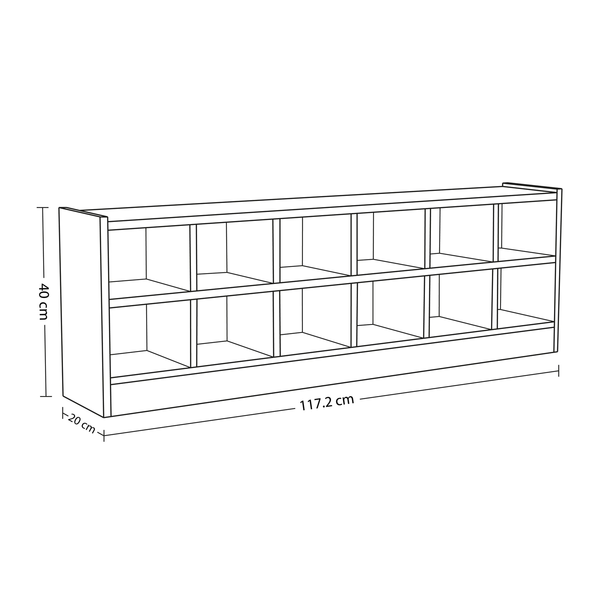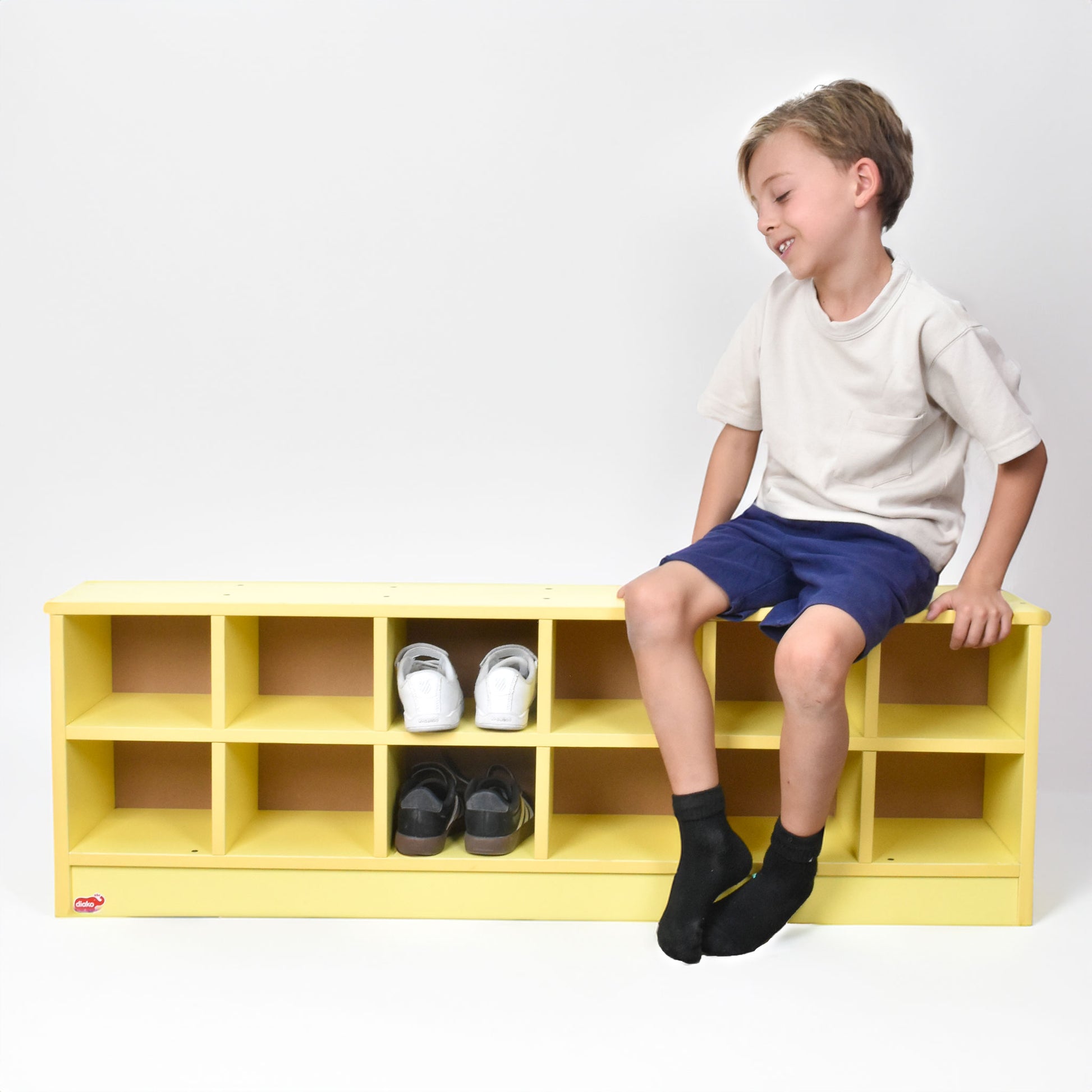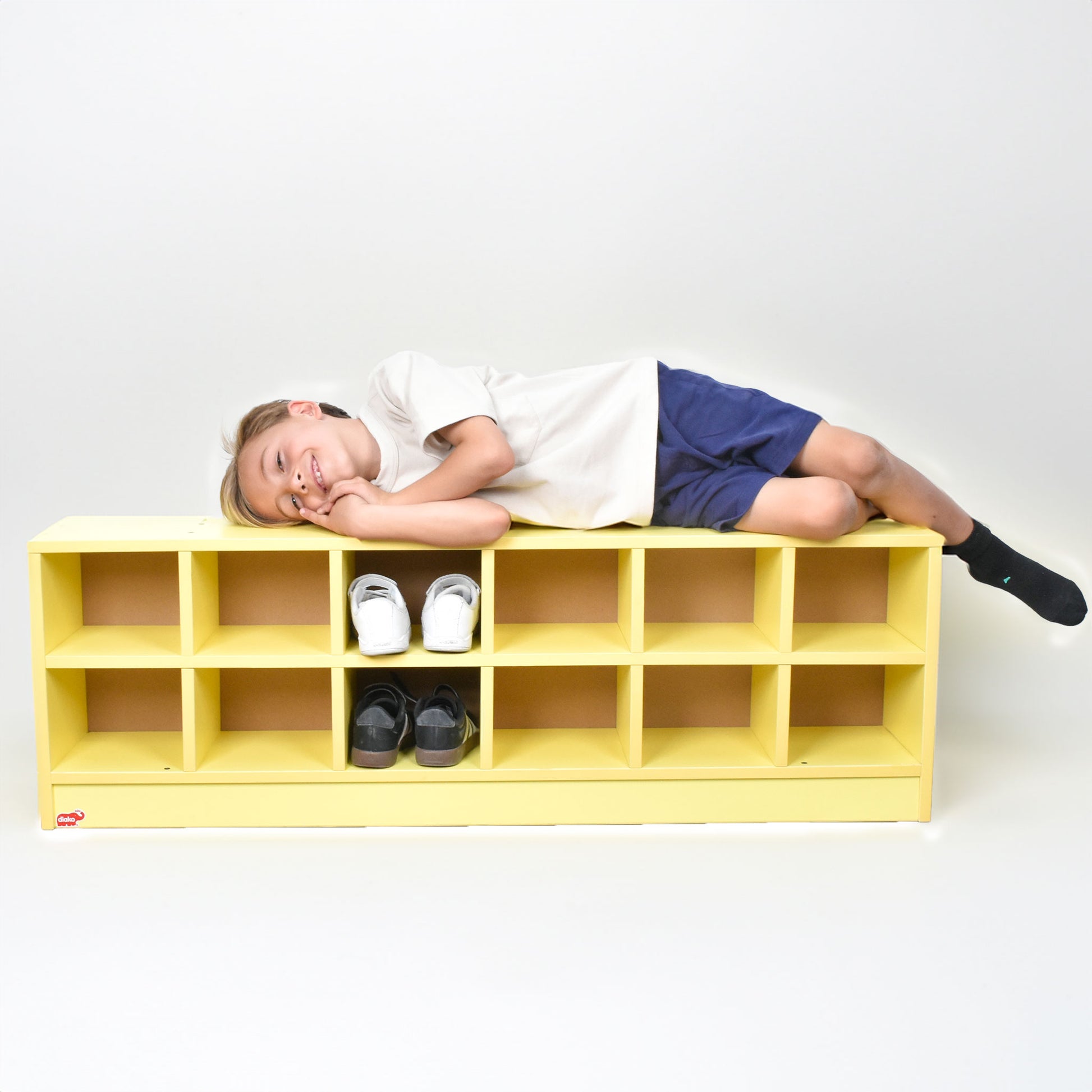 Mueble para acomodar zapatos, tiene 12 espacios para almacenar con el tamaño ideal para zapatos de niños, este mueble es adecuado para espacios de juego, espacios escolares o el hogar.