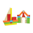 Divertido juego de construcción libre con bloques de madera de colores, construyen distintas estructuras utilizando la imaginación y su variedad de figuras, redondas, curvas, cuadradas y rectangulares.