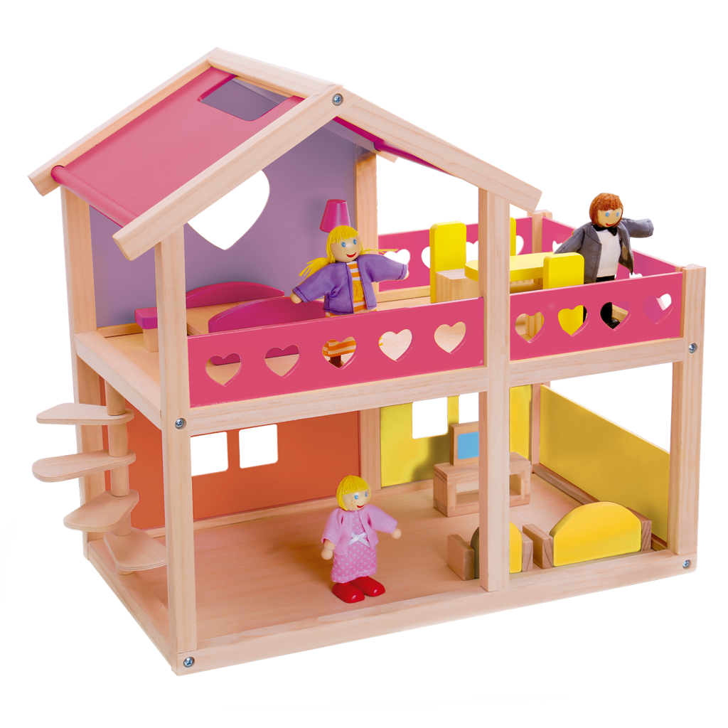 Convierte la imaginación en horas de juego con esta hermosa casa de muñecos de dos pisos. Fabricada en madera y pintada con colores vibrantes, cuenta con habitaciones amplias, balcón con barandales decorados con corazones y una divertida escalera lateral en espiral.