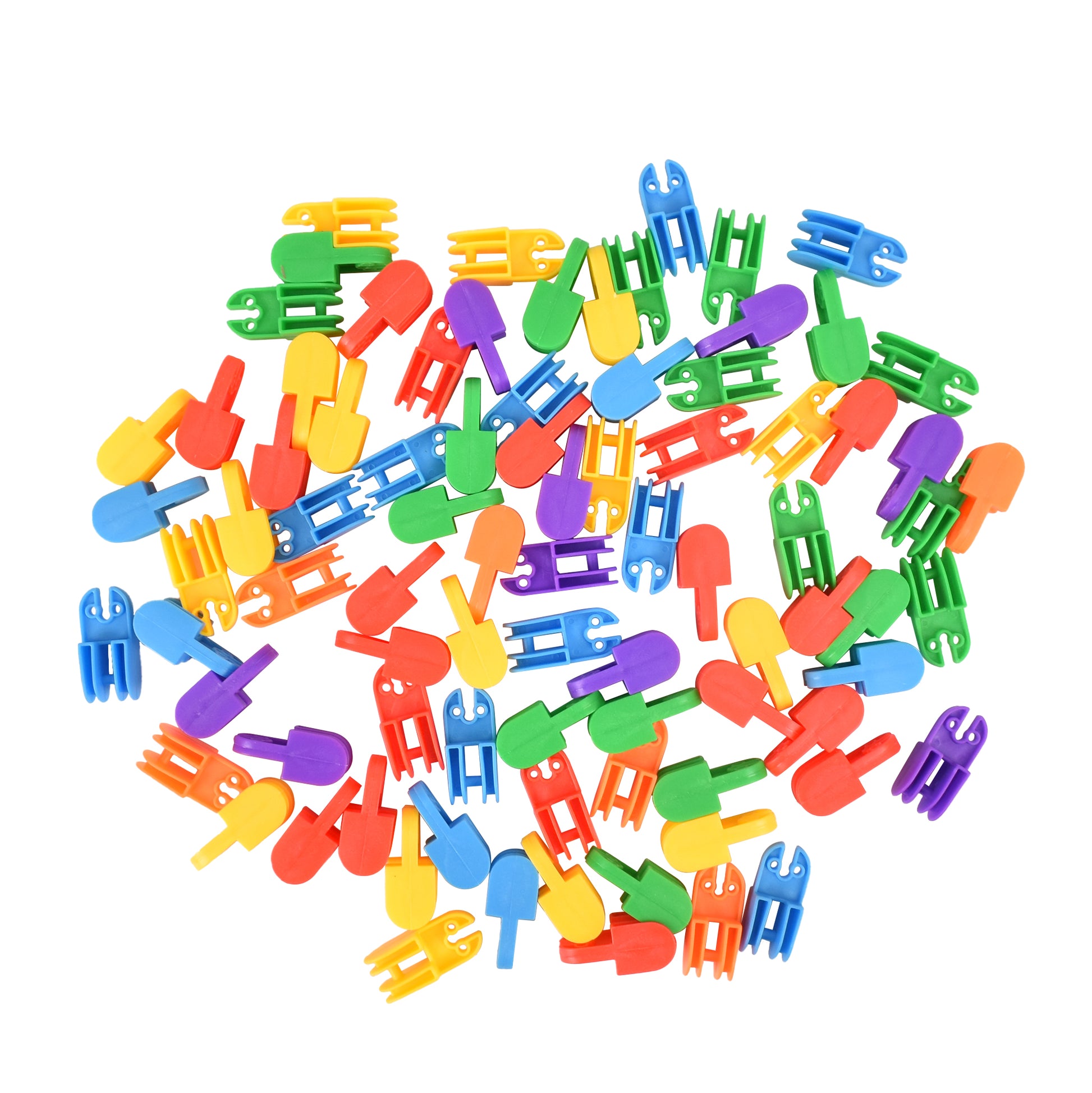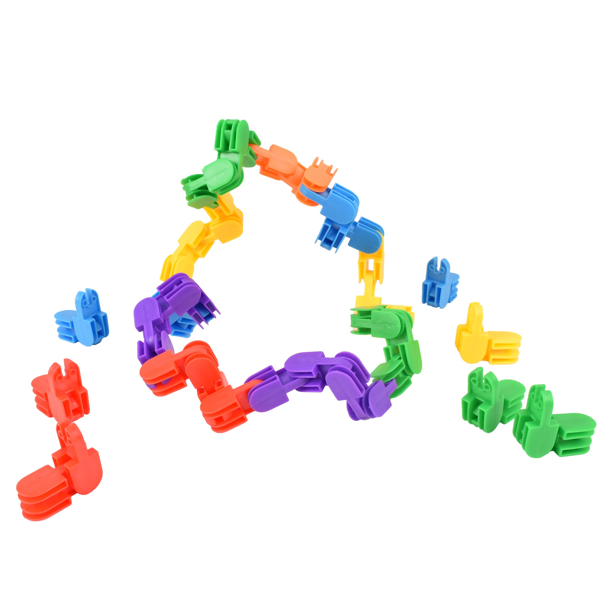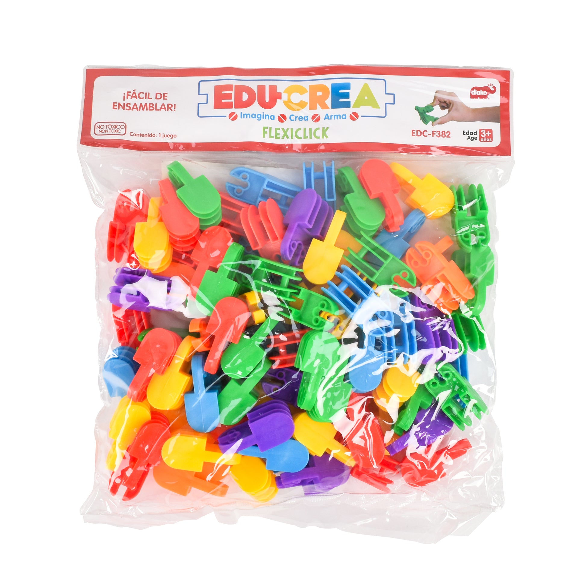 Juego de ensamble con piezas de plástico rígido que simulan una pinza y se unen entre sí con un "clic" para formar cadenas. Crea los diseños que tu imaginación te permita. Desarrolla las habilidades estratégicas, la coordinación ojo-mano, la psicomotricidad fina y la imaginación.