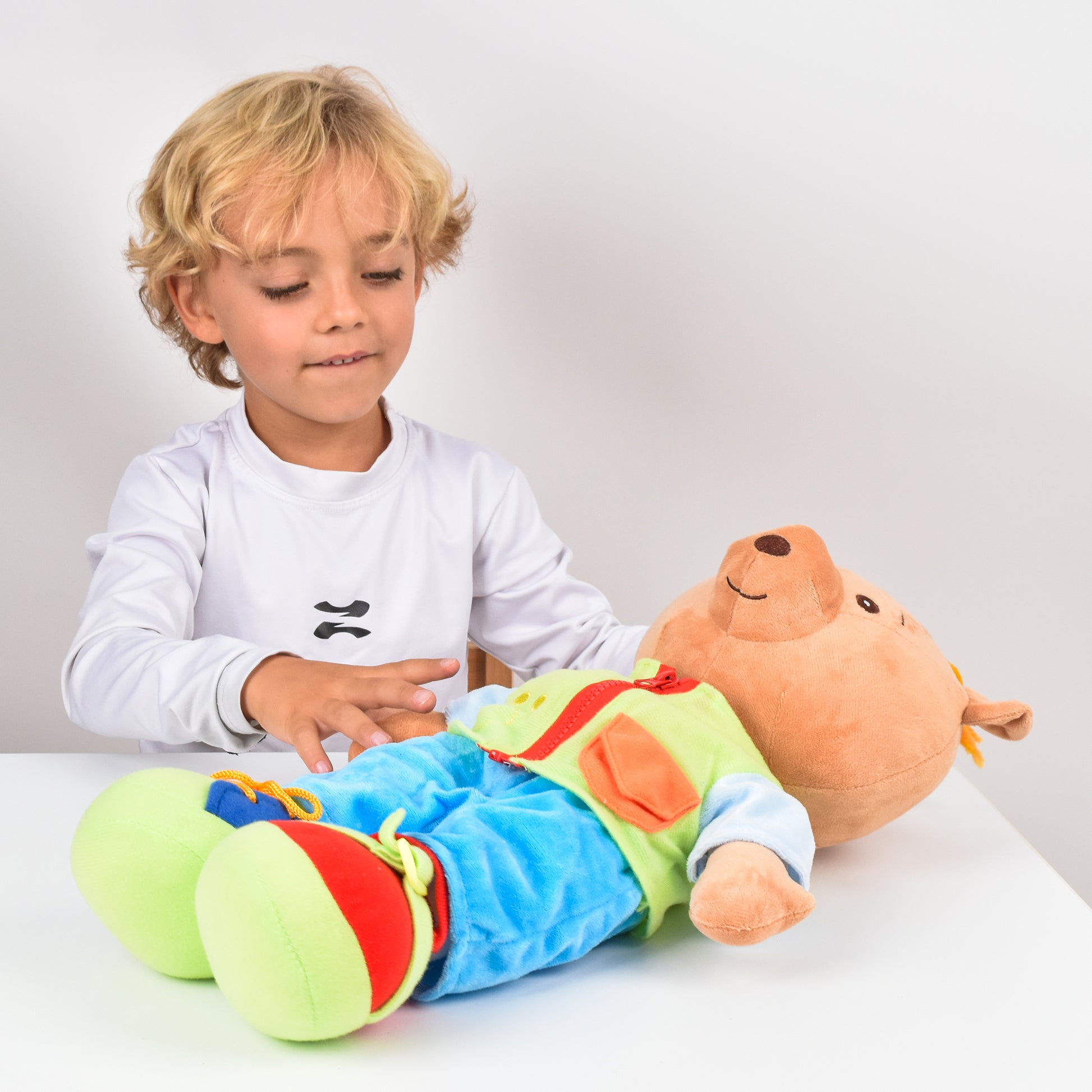 ¡Déjate llevar por la diversión educativa con nuestro muñeco didáctico! Es el compañero perfecto para explorar el mundo de las prendas de vestir de forma entretenida y educativa. Con una amplia gama de actividades que incluyen abotonar, atar agujetas, cerrar cierres y mucho más, este oso ofrece una experiencia de aprendizaje integral.
