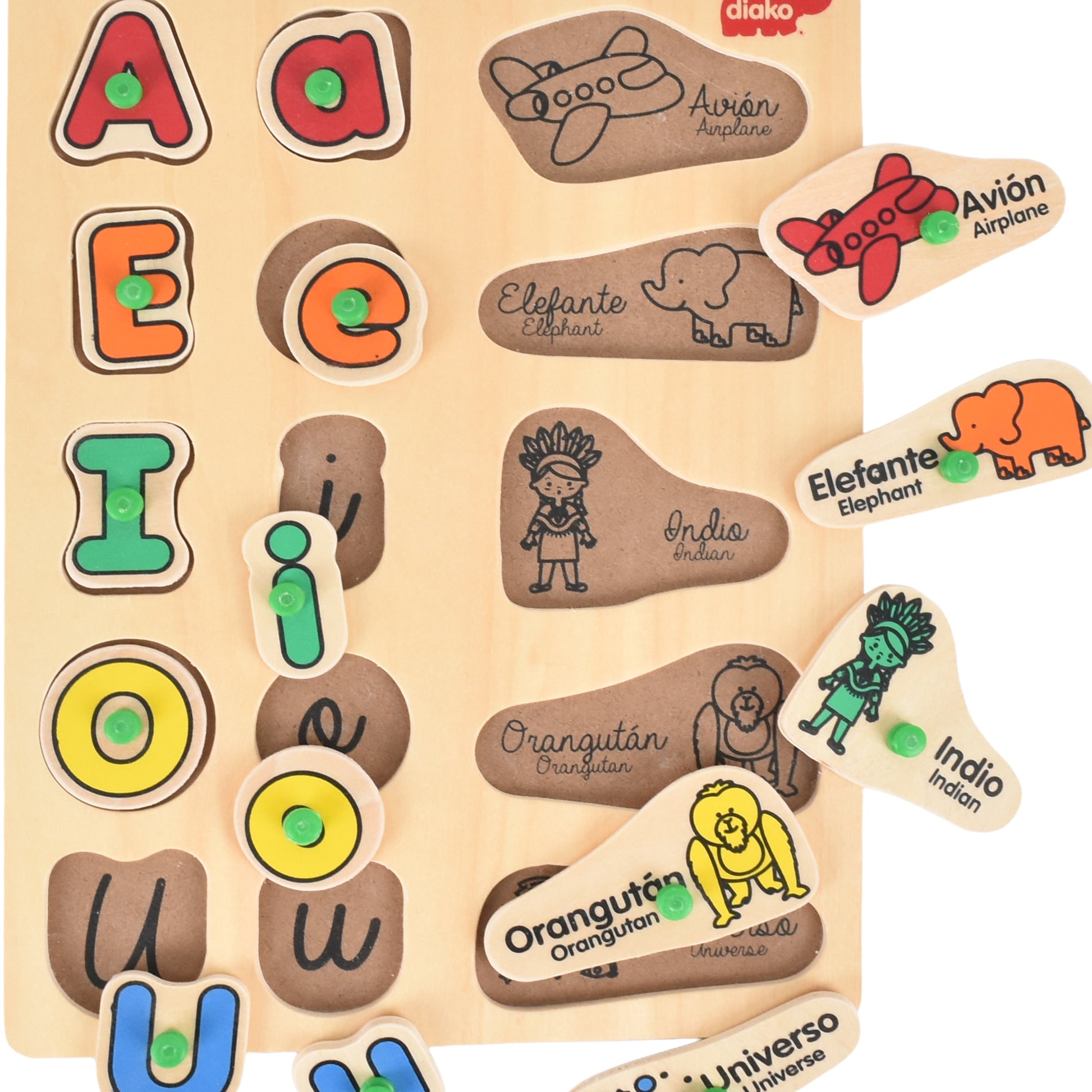 DESARROLLO | Nuestro rompecabezas ayuda a mejorar y fortalecer las habilidades motoras finas, estimular el desarrollo de la coordinación ojo-mano, lenguaje y la imaginación además de aprender a identificar las vocales en mayúsculas y minúsculas con cosas que inicien con cada vocal en español-inglés.