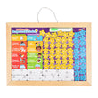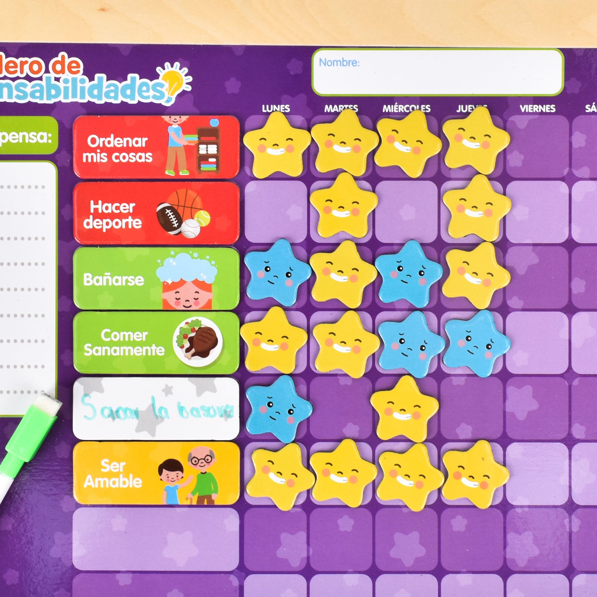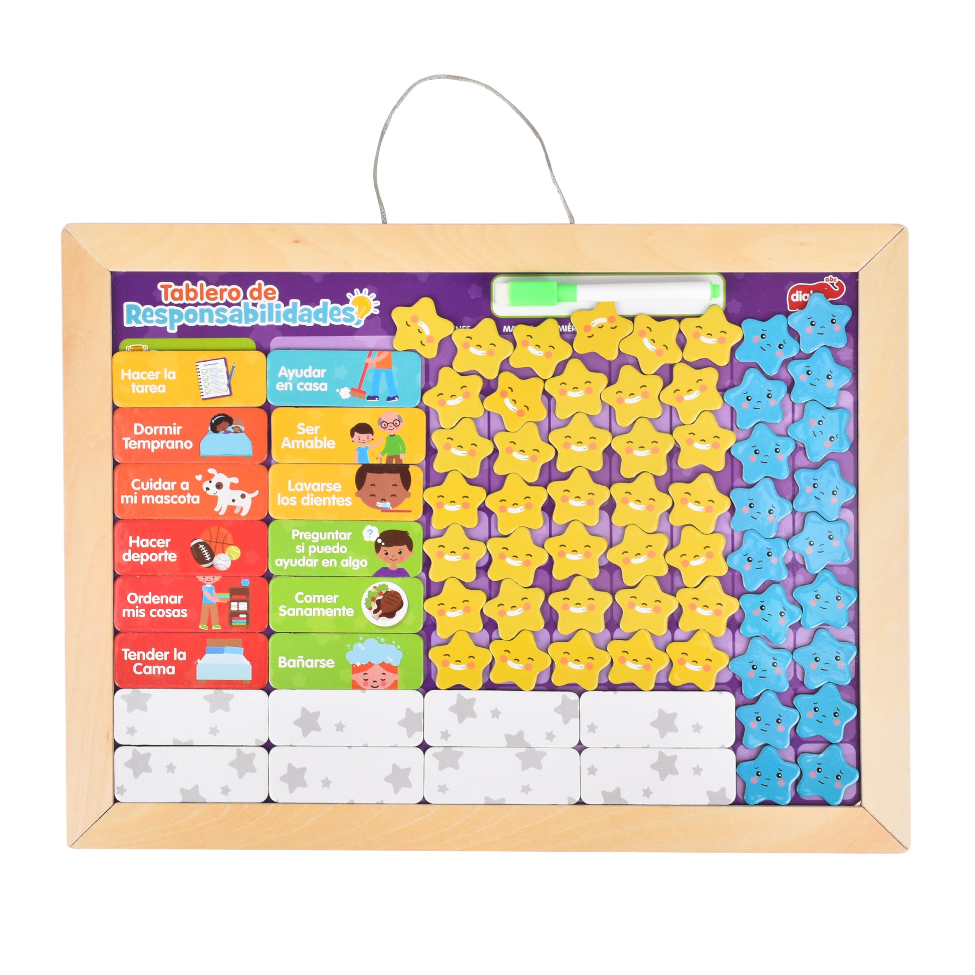 CONTENIDO| Cuenta con un marco de madera y con imán para que las piezas se mantengan, la parte trasera funciona como pizarrón. Incluye 1 tablero más pizarrón, 3 gises, 12 fichas de actividades, 18 estrellas azules y 36 estrellas amarillas.